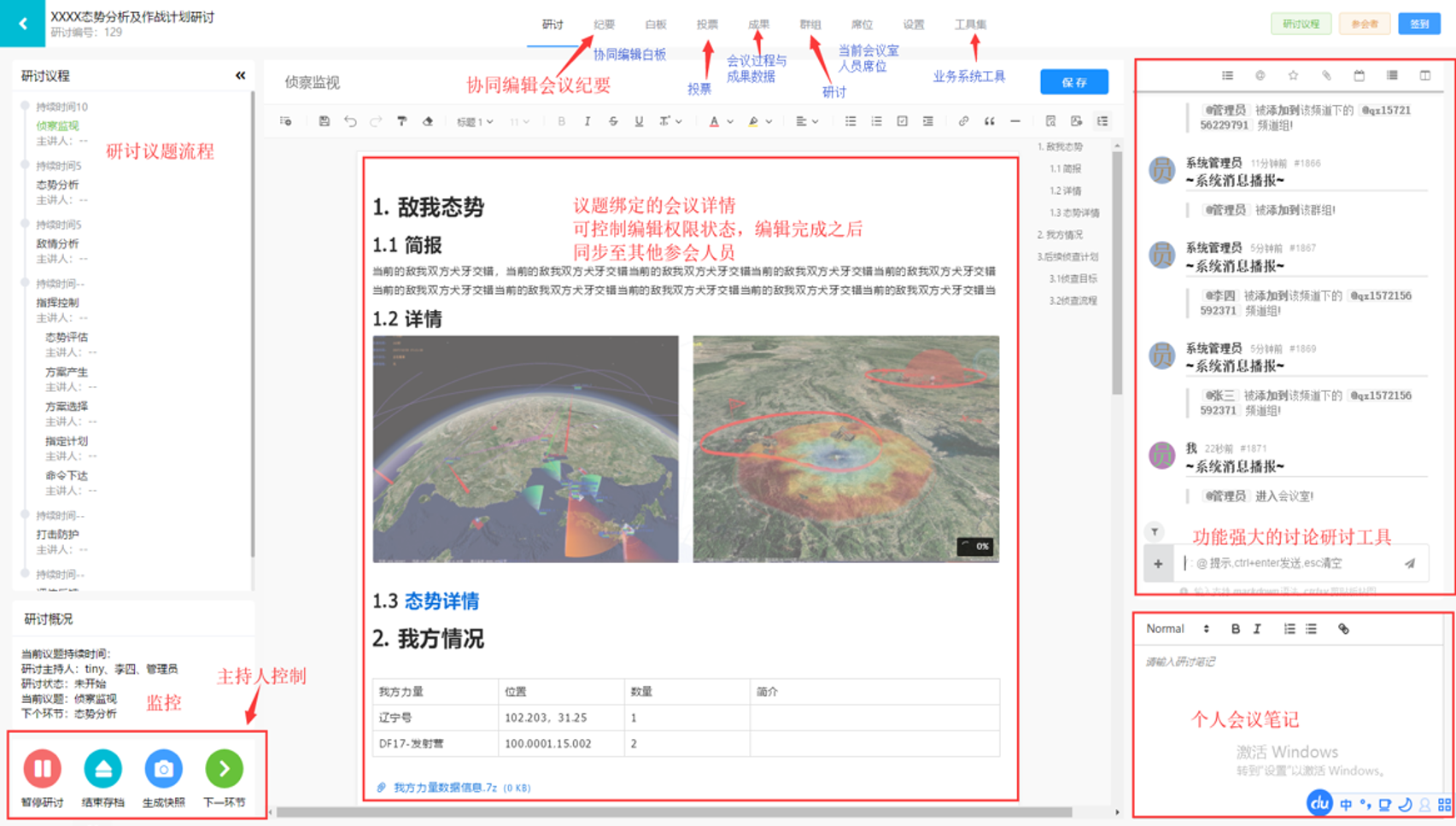 以高層研討廳、低層研討廳、作戰(zhàn)模擬與訓(xùn)練演習(xí)為研究對象,根據(jù)軍事戰(zhàn)爭需要,以軍事任務(wù)為牽引,組成結(jié)構(gòu)為基礎(chǔ),對每個組成部分進(jìn)行功能需求分析,建設(shè)成一個具有功能相對完善、結(jié)構(gòu)相對完整,各部分關(guān)系相互協(xié)調(diào)的研討廳體系。
