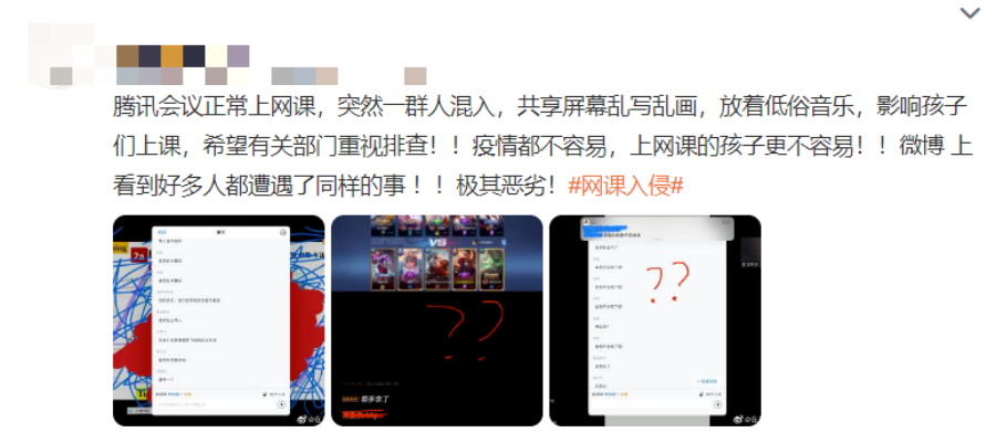 學(xué)生通過騰訊會(huì)議、釘釘?shù)绕脚_(tái)上網(wǎng)課時(shí),突然有一些陌生人涌入直播間,有人謾罵老師和學(xué)生,有人放哀樂,甚至散發(fā)淫穢色情視頻。